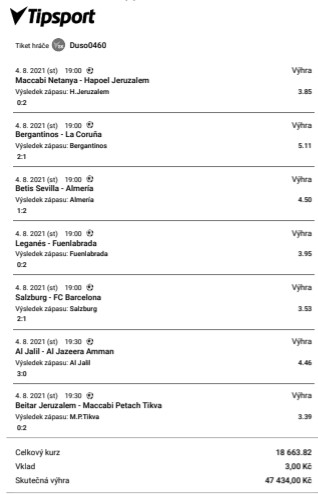 Slovenský sázející u Tipsportu s nickem Duso0460 vsadil tiket, který se skládal ze 7 fotbalových utkání. Celkový kurz tiketu byl 18 663,82.