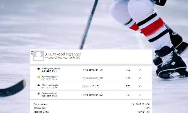 Doporučujeme hokejový tiket, kterým se inspirovalo již více jak 100 sázejících!V TIKET ARÉNĚ u Chance hledáme zajímavé a hodnotné tikety, který oslovil mnoho sázejících. Tyto tikety předkládáme ...