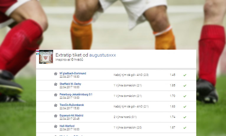 Doporučujeme fotbalový EXTRA tiket, kterým se inspirovalo již více jak 100 sázejících!V TIKET ARÉNĚ u Chance hledáme zajímavé a hodnotné tikety, který oslovil mnoho sázejících. Tyto tikety ...