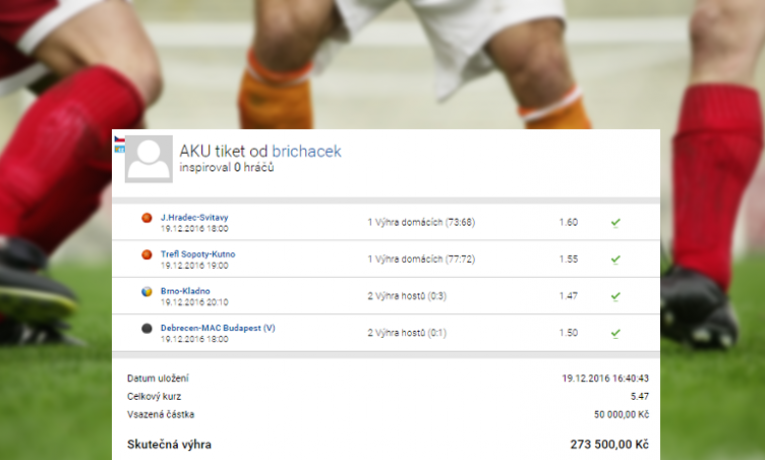 Tiket týdne: Sázkař vsadil za dvacku a vyhrál 24.229,- Kč!