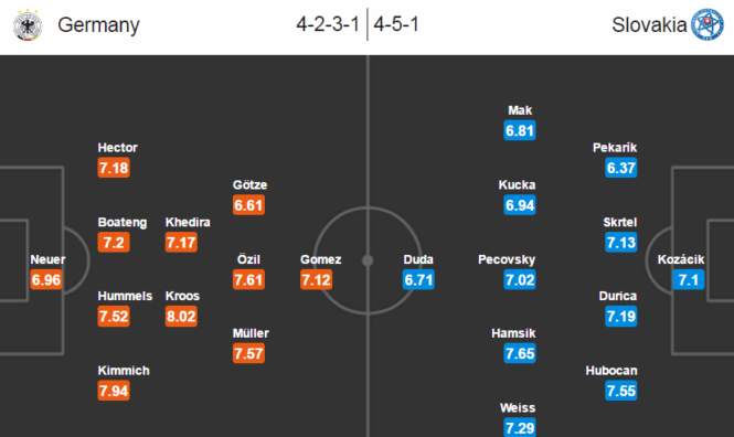 | Jogi Low bude asi trvat na stejné sestavě, která naskočila od začátku zápasu proti Severní Irům, které Němci zvládli 1:0. Proti Irům mohli Němci dát více branek, ale dobře zachytal Michael McGovern. Joshua Kimmich bude pokračovat na pravém obránci a do útoku se asi postaví Mario Gomez. Jerome Boateng se stihne uzdravit z menšího zranění. S ze žlutou kartou jdou do zápasu Mesut Ozil, Boateng a Sami Khedira. | Slovenksý trenér Ján Kozák asi zůstane u rozestavení 4-5-1, které mu pomohlo uhrát s Anglií remízu 1:1. Slovensko má 7 hráčů, kteří obrdrželi v průběhu turnaje žlutou kartu. |