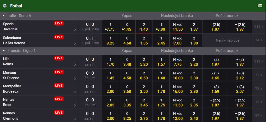 V rámci sekce LIVE krom probíhajících zápasů se budou nacházet v nabídce i fotbalová, hokejová a tenisová utkání. Zápasy, které ještě nebyly rozehrány, se budou v sekci LIVE nacházet s aktuálním skóre 0:0 s přesným termínem jeho začátku, tak jak můžete vidět níže. Italská první liga již probíhá a zápasy z Ligue 1 teprve začnou na 9 minut.