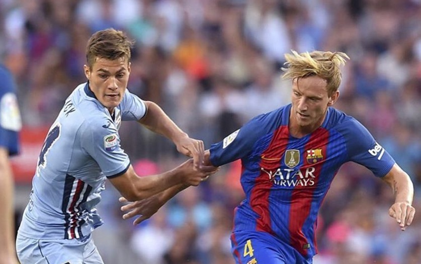 Patrik Schick na Camp Nou v souboji s Ivanem Rakitičem.