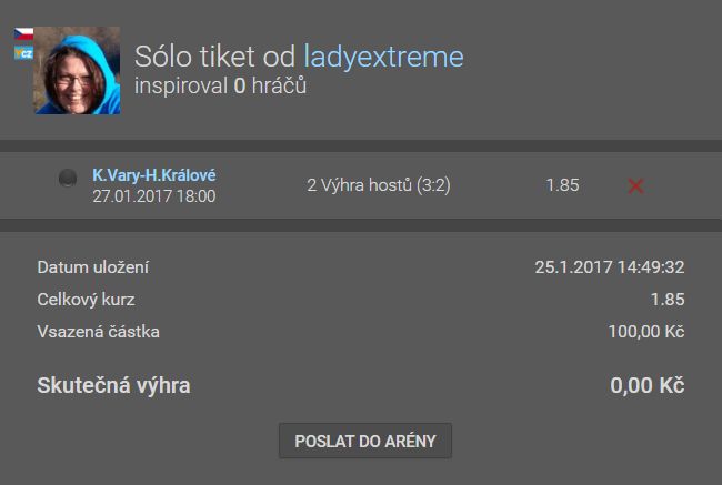 Jen jednou v rámci těchto sázek jsem se dostala do 2. sázkového kola, nikdy ne přes něj. Celkově jsem prosázela 770 korun. Vzhledem k tomu, že jsem se jednou dostala do 2. sázkového kola a z výhry jsem si uškudlila 30 korun a vzhledem k tomu, že jedna z těchto sázek vycházela z úvodní sázky 100 korun, celkem jsem přišla o 570 korun.
