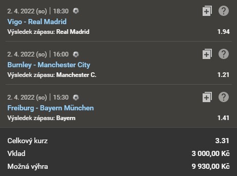 Pistelka vsadil tři sobotní fotbalové zápasy ze tří TOP evropských soutěží, vždy na favorita o titul. První zápas na tiketu začíná v 15:30 v sobotu 2.4.