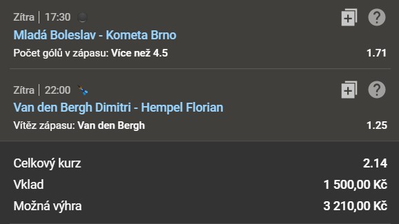 Celkový kurz tiketu je 2.14 se dvěma sázkovými příležitostmi. Při jeho vkladu 1 500 Kč se může hodinu před půlnoci radovat z výhry 3 210 Kč. Inspirovalo se již devět sázejících, ale je stále dostatek času. Přidáte se také anebo své peníze dáte na jiné zápasy?