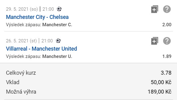 Z Tiket arény byl vybrán tiket od českého sázejícího recycledtresh1, který vsadil padesát korun na dvě finálová fotbalová utkání. První finálové utkání se hraje ve středu od 21 hodin, druhý v sobotu ve 21 hodin. Jestliže tiket vyjde, pak sázející vyhraje 189 Kč, kurz tak vychází na 3.78. Zatím se nikdo inspiroval, ale je stále dostatek času, aby se přidali další.