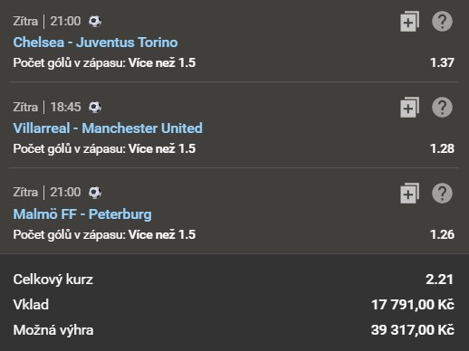 V Tiket Aréně byl od slovenského sázejícího Sondre zveřejněn tiket, který je zaměřen na úterní zápasy Ligy mistrů. První zápas začíná pět minut před 19. hodinou. Zbylé dvě utkání začínají ve 21 hodin. Celkový kurz tiketu je 2,21 se třemi sázkovými příležitostmi. Při jeho vkladu 17 791 Kč může vyhrát 39 317 Kč. Inspirovalo se přes 100 sázejících, ale je stále dostatek času. Přidáte se také anebo své peníze dáte na jiné zápasy?
