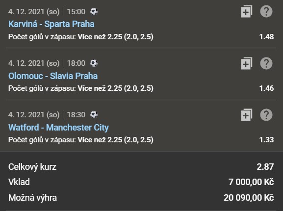 V Tiket Aréně byl od českého sázejícího Rgjm001 zveřejněn tiket, který je zaměřen na sobotní fotbalové zápasy. První zápas začíná ve tři hodiny odpoledne.
