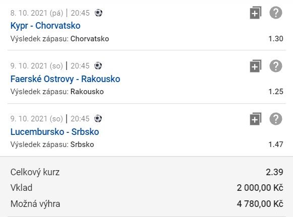 V Tiket Aréně zveřejnil Baaja12 AKU tiket, který je zaměřen evropskou kvalifikaci na Mistrovství světa. První zápas začíná v 20:45 8. října, druhý a třetí zápas o 24 hodin později. Tiket tedy obsahuje tři utkání s celkovým kurzem 2,39. Při jeho vkladu 2 000 Kč může vyhrát 4 780 Kč. Prozatím se inspirovalo osm sázejících. Přidáte se také anebo své peníze dáte na jiné zápasy?