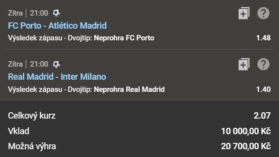 V Tiket Aréně se nachází tiket od Jiri4638, který u Chance vsadil tiket na dva úterní zápasy Ligy mistrů, které se budou hrát dnes od 21 hodin.