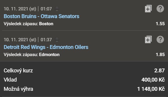 V Tiket Aréně byl od sázejícího ZkratCZE zveřejněn tiket, který je zaměřen na středeční zápasy NHL. První zápas začíná sedm minut po jedné hodině ráno a druhý začne o třicet minut později. Celkový kurz tiketu je 2,87 se dvěma sázkovými příležitostmi. Při jeho vkladu 400 Kč může vyhrát 1 148 Kč. Prozatím se nikdo neinspiroval, ale je stále dostatek času. Přidáte se také anebo své peníze dáte na jiné zápasy?