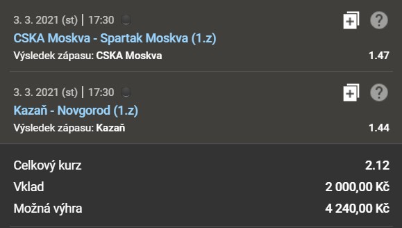 Kurzy jsou podobné jako v základní části, souhlasím, že mohly být trošku vyšší, když se jedná o play-off, ale když jsem se díval zpětně na osmifinále, tak za poslední čtyři ročníky má CSKA bilanci 16-0 (4x postup), Spartak 4-12 (3x nepostoupili, jednou se do play-off ani nedostali), Kazaň 12-6 (3x postup, 1x vypadli s 0:4 na zápasy), Nižnij Novgorod 4-16 (4x vypadli). Tak jsem si utvrdil názor v tom, abych tento tiket vybral z Tiket arény.