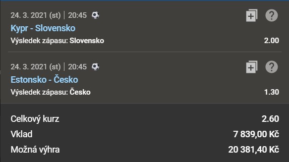 Z Tiketarény jsme vybrali tiket od slovenského tipaře belasy31, který vsadil 7 839 Kč na dvě fotbalové utkání, které se budou hrát ve středu 24.3. od 20:45. Při výhře může vyhrát 20 381,40 Kč, kurz tak vychází na 2.60. Zatím se inspirovalo dvaadevadesát sázejících, ale je stále dostatek času.