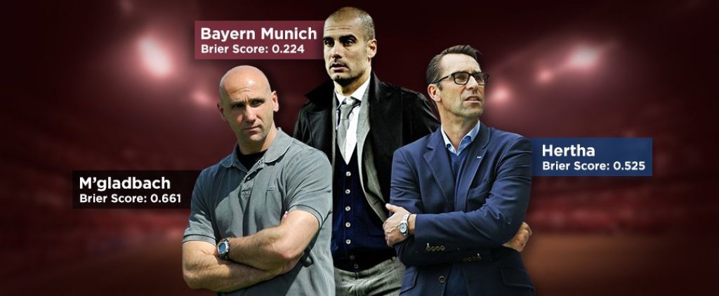 Nízké Brierovo skóre Bayernu Mnichov nám prozrazuje, že tým si vede přesně tak, jak se od něj očekávalo. V případě Bayernu jsem Brierovo skóre musel hned dvakrát zkontrolovat, neboť se jedná o to nejnižší skóre, které jsem kdy viděl. Převaha Bayernu v lize je velmi patrná i z vypisovaných kurzů – průměrná pravděpodobnost, že vyhraje domácí zápas, je k dnešnímu dni 82,1%.