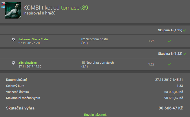 Co vedlo sázkaře s přezdívkou tomasek89 k tomu, aby vsadil 68 tisíc korun na KOMBI tiket o 2 skupinách po 1 příležitosti s celkovým kurzem 1,33? Z jakých relevantních dat, potažmo statistik při skládání své níže přiložené chlouby vycházel a na kolik si díky tomu přišel? Tyto a mnohé další dotazy se vám pokusí zodpovědět následující analýza tiketu Chance.