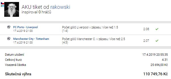 Středeční odvety čtvrtfinále Ligy mistrů přinesly 2 atraktivní přestřelky, které fanouškům prvotřídního fotbalu a milionářské soutěže nabídly v součtu neuvěřitelných 12 gólů. To se skvěle hodilo do krámu mnoha sázkařům. Názorným důkazem budiž klient Tipsportu s přezdívkou rakowski, který si díky výsledkům zápasů FC Porto – Liverpool a Manchester City – Tottenhem přišel na výhru přes 110 tisíc. Následující analýza tiketu vám odpoví nejen na to, kolik při tom riskoval.