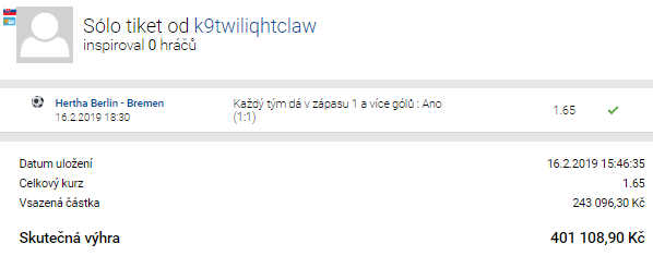 Utkání skončilo 1:1, z čehož plyne, že jediná podmínka pro kladné vyhodnocení výše přiloženého tiketu byla bezezbytku splněna. Vkladová částka ve výši 243.096,30 Kč se tak po vynásobení kurzem 1,65 přeměnila na super výhru 401.108,90 Kč!