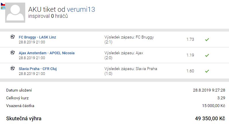 Jednotlivé zápasy a pohnutky, které k podání výše přiloženého tiketu nejspíše vedly, jsme si rozebrali. Nyní pojďme k číslům. Verumi13 vsadil na Tipsport AKU tiket 15 tisíc korun v celkovém kurzu 3,29. Vzhledem k tomu, že fotbalisté Brugg, Ajaxu i Slavie odvetu zvládli a postoupili tak do základní skupiny LM, zinkasoval tentýž den večer 49.350,- Kč!