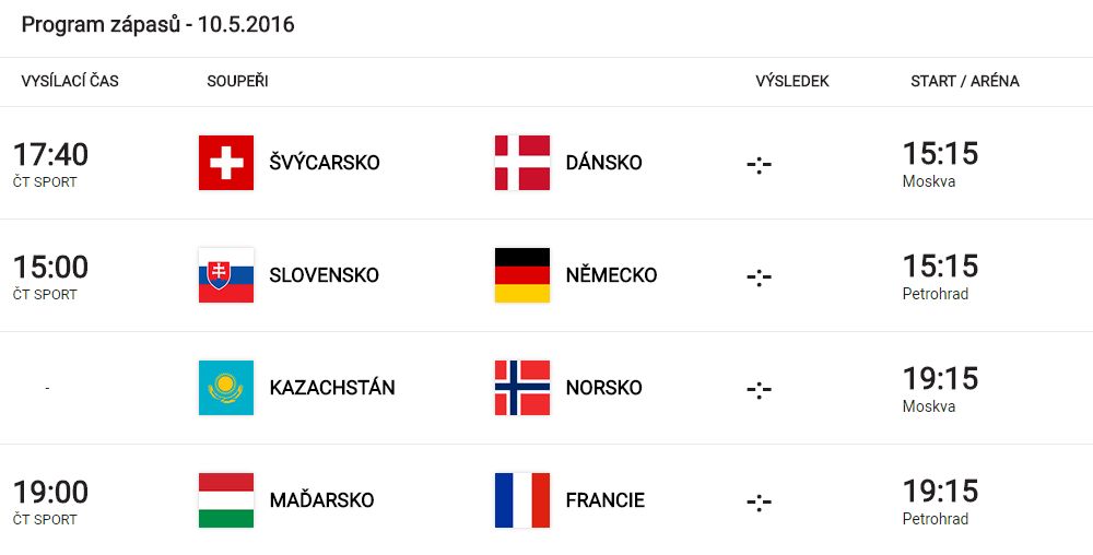 Zatímco Čeští hokejisté budou po vypjatém utkání se Švédskem v úterý odpočívat, MS světa v hokeji 2016 se přihlásí s další čtveřicí zápasů. Těšit se tak můžeme třeba na utkání mezi dvěma našimi sousedy – Slovenskem a Německem.