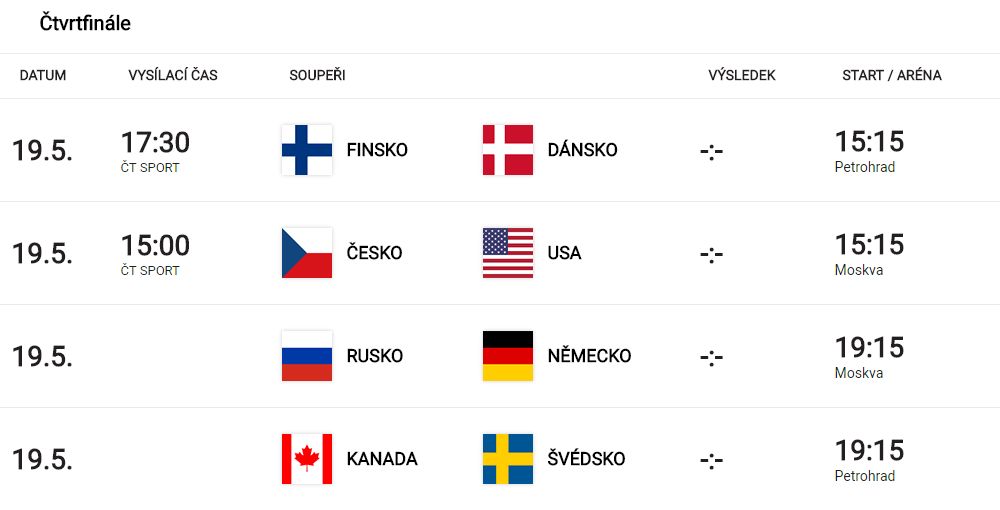 Jelikož jsou Kanaďané jasnými profesionály, z této své předešlé chyby se určitě poučí a do zápasu se Švédskem nastoupí plni odhodlání odvést i černou práci a postup do semifinále si poctivě vydřít. Švédsko by přitom nemělo klást žádný velký odpor, neboť není v ideálním rozpoložení a na celém turnaji zatím nic nepředvádí.