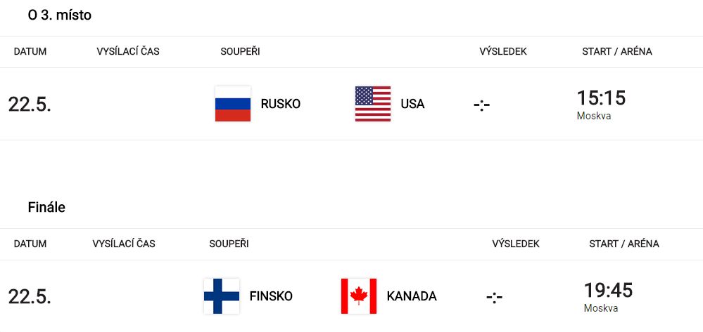 Dvojice semifinálových zápasů na MS v hokeji 2016 určila, že o příčky nejvyšší se v neděli utká Finsko a Kanada, zatímco domácí Rusko vyzve na souboj o třetí místo svého největšího protivníka pod sluncem – Spojené státy americké.