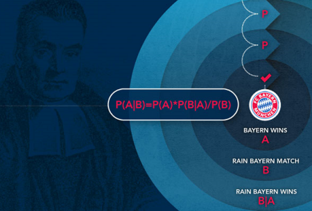 Nyní se konečně podíváme na to, jak Bayesova analýza funguje ve skutečné praxi. Řekněme, že si chcete vsadit na zápas Bayernu Mnichov a myslíte si, že Bayern má šanci na výhru přesně 50 %. Také víte, že když Bayern vyhraje, v 11 % případů prší, kdežto obvyklá šance na déšť během zápasu tohoto týmu je 10 %.