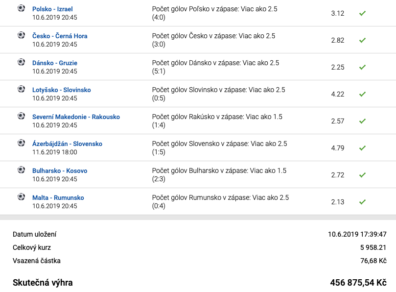 8 OK tipů na počet gólů ve fotbale se často nevidí. Kolik schopností a dovedností bylo potřeba k sestavení tohoto tiketu, případně kolik štěstí bylo potřeba, aby tiket vyšel, můžete posoudit sami: