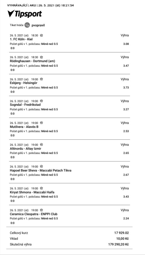 Tiket podal v čase 18:21, kdy za devět minut už začínaly první dva zápasy na tiketu. Zbylých sedm utkání začalo v 19 hodin. Že mu tiket vyšel, se dozvěděl v čase kolem 19:50, tedy za pouhou hodinu a půl se mu povedlo svůj vklad zhodnotit 17 929x.