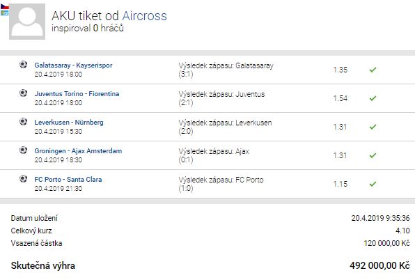 Všech 5 podmínek bylo splněno a tiket byl tak vyhodnocen jako výherní. Aircross tak ze svého vkladu 120.000,- Kč po vynásobení celkovým kurzem 4,10 vytěžil u Tipsportu vynikající odměnu ve výši 492.000,- Kč!