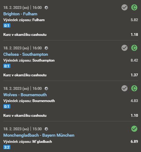 V dalších utkáních se vývoj v prospěch sázejícího převalil během druhého poločasu, Crystal Palace se dostalo do vedení v 69. minutě, Bournemouth v 49. minutě a Fulham v 88. minutě. Následně sázející se rozhodl využit cashoutu, udělal dobře, jelikož Crystal Palace obdrželi vyrovnávací branku v šesté minutě nastavení.