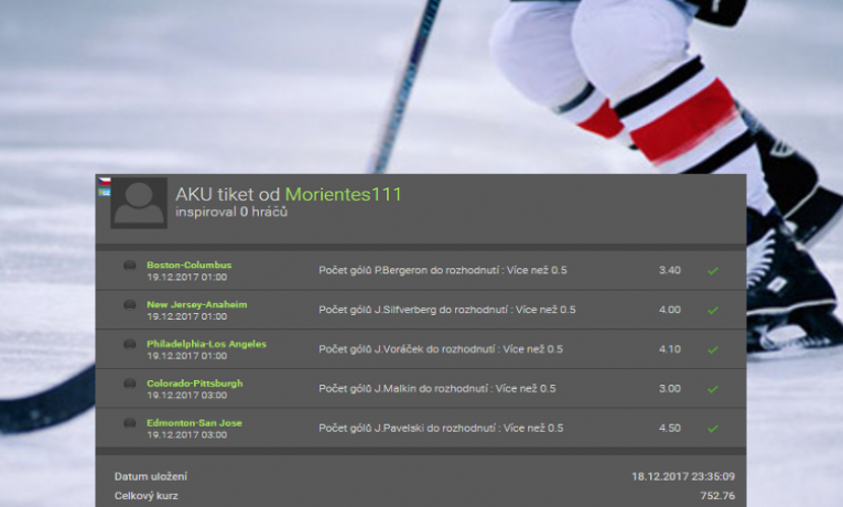 Rozbor tiketu z NHL: Kterých 5 střelců zařídilo z 6 stovek 425 tisíc?