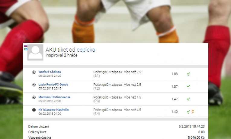 Sázení na počty gólů se coby strategie z kraje února dobře osvědčila tipérovi cepicka, který díky ní a 4 sázkám nakombinovaným z fotbalu a hokeje oškubal Tipsport o více než 23 tisíc korun. Pravda, ...