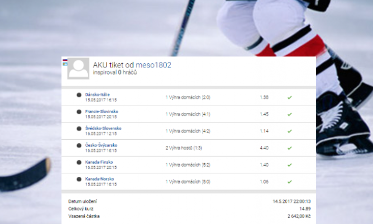Doporučujeme hokejový tiket, kterým se inspirovalo již více jak 100 sázejících!V TIKET ARÉNĚ u Chance hledáme zajímavé a hodnotné tikety, který oslovil mnoho sázejících. Tyto tikety předkládáme ...