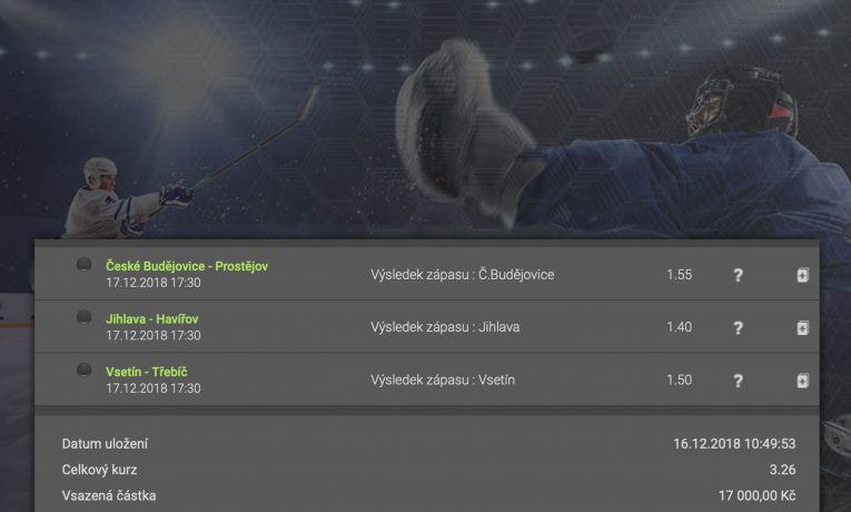 Hokejovým tiketem se inspirovalo více jak 100 sázejících – platnost tiketu 17.12.
