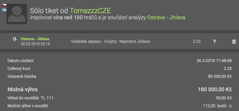 Tipař s nickem TomazzzCZE využil vysokého kurzu na neprohru Jihlavi a vsadil rovných 80.000 Kč. Více jak 100 sázejících se inspirovalo jeho tiketem. Přidáte se také, nebo vsazené peníze poputují sázkovce?