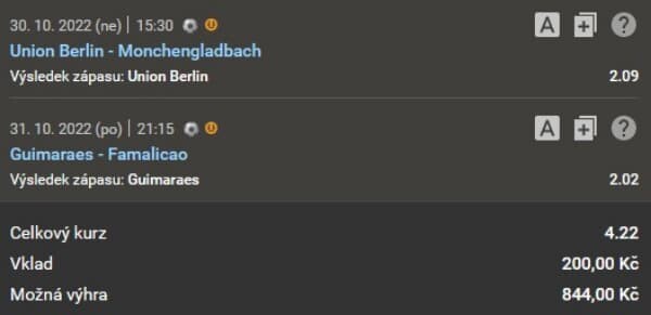 Sázka na tříbodový zisk lídra tabulky německé Bundesligy Unionu Berlín v domácím utkání s průměrnou Borussií Mönchengladbach a důvěra ve vítězství Vitórie Guimaraes, která přivítá v pondělní dohrávce jedenáctého kola nejvyšší portugalské fotbalové ligy ve venkovních zápasech prozatím nevýrazné Famalicao, to je další Sforziho odvážný tiket s hodnotným kurzem 4.22 a s tradičním vkladem 200,-Kč.