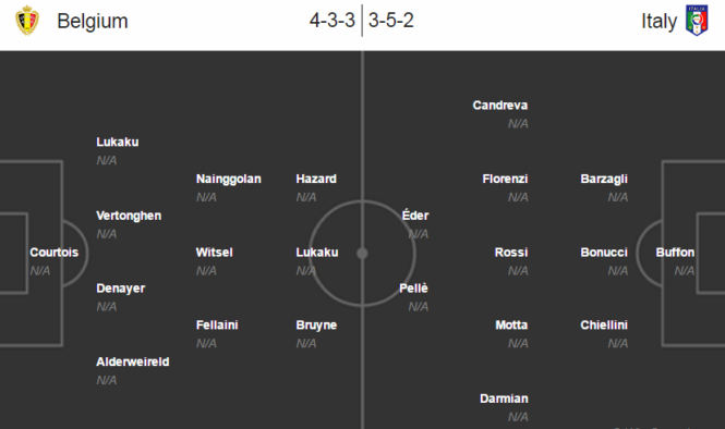 | Problémy má před zápasem s Itálií Thomas Vermaelen. To znamená, že by se na levém kraji obrany mohl objevit Jordan Lukaku a Jan Vertongen by šel do středu. Romelu Lukaku na hrotu čelí konkurenci v podobě Christiana Bentekeho, Michy Batshuayi a Divocka Origiho, ale hráč Evertonu by měl šampionát načnout. Mousa Dembele asi zůstane jen na lavičce, neboť ve středu pole budou operovat Radja Nainggolan, Axel Witsel a Marouane Fellaini. | Antonio Conte asi začne ve středu pole s Thiago Mottou a Daniele De Rossim a bude tak spoléhat na zkušenosti těchto borců. Útok by měli vést Graziano Pele a Eder, možná ale Conte zvolí Simone Zazu na nějaké místo. V obraně naskočí famózní trio z Juventusu a záda jim bude krýt jako obvykle spoluhráč Buffon. |