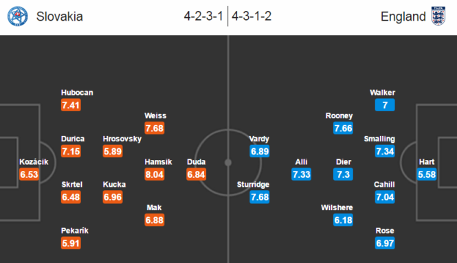 | Slovensko nemá žádný důvod, proč by mělo se základní sestavou hýbat, neboť minulý zápas vyhráli 2:1 nad Ruskem. Nyní mají opravdu velkou šanci dostat se v turnaji dále. | Otazník visí nad startem Raheema Sterlinga a Harryho Kana, protože oba byli v zápase proti Walesu střídání již o poločase a jejich náhrady Jamie Vardy a Daniel Sturridge pak dali obě branky Angličanů a zvrátili tak skóre utkání na stranu své země. Angličané tak vedou Skupinu B. S oběma zmíněnými hráči se nyní počítá do základní jedenáctky, což by mohlo znamenat změnu rozestavení z 4-3-3 na 4-3-1-2. Roy Hodgson by tak mohl posunout Dele Alliho do více útočné pozice a do středu pole dát Jacka Wilshera. Pozice Joe Harta je v celku ne úplně jistá po tom, co obdržel gól z dalekonosné rány Bala. Roy Hodgson ale svou jedničku v bráně na turnaji podrží. |