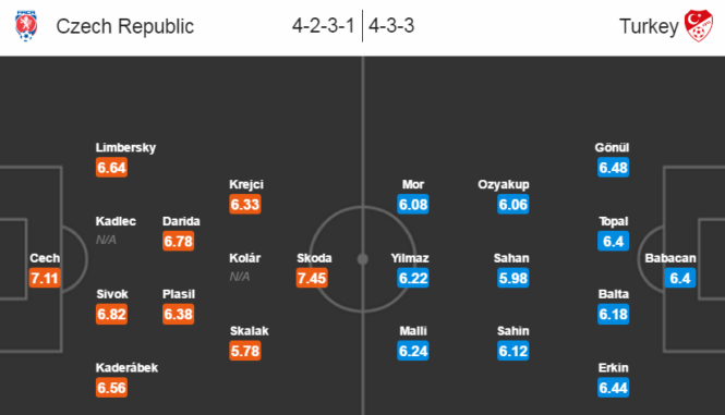 | Tomáš Rosický je out na 3-6 týdnů se zraněním zadního stehenního svalu a jeho mezinárodní kariéra je asi u konce. Bořek Dočkal se zatím do žádného zápasu nedostal (kvůli zranění) a se svojí kreativitou v útočné třetině hřiště musí k duelu nastoupit. Do základu se možná minulým výkonem dostal Milan Škoda, i když na hřišti strávil jen chvíli (dal gól po 8 minutách na trávníku). | Turecko v minulém střetnutí prohrálo se Španěli 3:0 a jsou již skoro mimo turnaj. Pro svěřence Fatiha Terima to není dobrý šampionát. Fanoušci svůj hněv obrátili na Ardu Turana a hráč Barcelony asi v posledním klání skupiny ani nebude od začátku na hrací ploše. Turan možná také nebude jediným hráčem, který přijde o své místo v sestavě. Hakan Calhanoglu byl v poločase zápasu se Španělskem střídán a asi také nebude na poslední klání do základu nominován. |