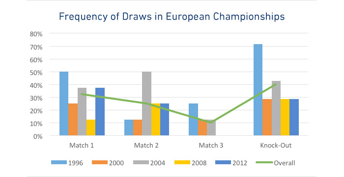 Každý zápas měl podle vypsaných sázkových kurzů pravděpodobnost remízy v rozmezí 15% – 37%, přičemž drtivá většina (71% zápasů) měla pravděpodobnost remízy mezi 27,5% až 32,5%. V každé fázi turnaje (první zápas, druhý zápas, třetí zápas a vyřazovací fáze) se průměrná pravděpodobnost remízy pohybovala v rozmezí 25% – 30%. Pro jakýkoliv fotbalový turnaj je ještě důležitější, že během našeho zkoumání jsme nenarazili na žádné rozdíly v pravděpodobnosti remízy v jednotlivých fázích. Vzhledem k pedantskému přístupu jsme se rozhodli každou možnou dvojici srovnat testem z-skóre.
