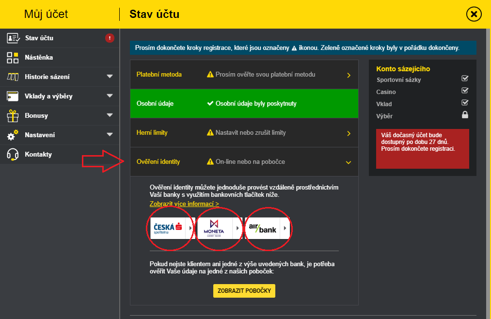 Po zběžné registraci do Fortuny v systému zadáte možnost registrace skrze banku. Banka, u které máte účet, potom s vaším souhlasem odešle do Fortuny všechny potřebné informace, které by Fortuna jinak musela získávat z vašeho občasného průkazu při návštěvě kamenné pobočky (jméno, příjmení, datum narození, rodné číslo atd.).