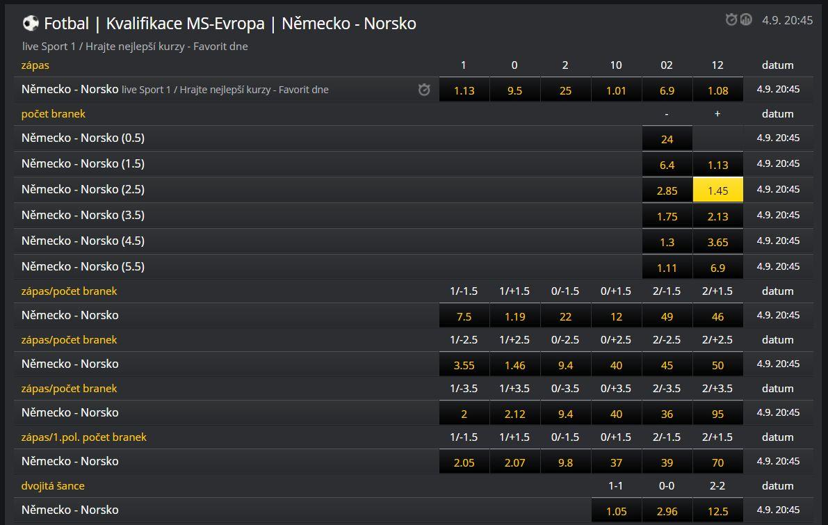 Vidíš, dala jsem tam špatný obrázek. A ten dobrý smazala. Tady je to něco podobného. Německo – Norsko +2,5g 1,45/výhra domácích 1,13 a výhra Německa a 2,5 g 1,46… 🙂