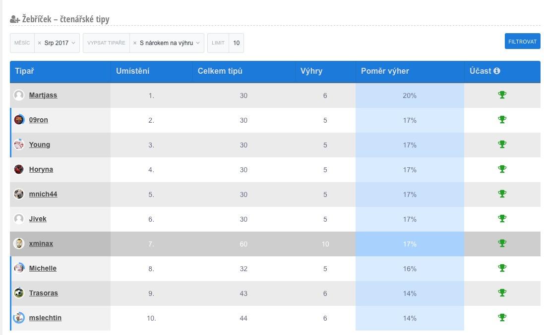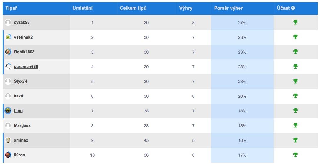 Výpočet hodnocení najdete v pravidlech dole. Hodnoceni odráží kvalitu a aktivitu tipaře.
