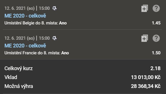 Z Tiket arény byl vybrán tiket od českého sázejícího Zumbrigen, který vsadil přes 13 tisíc korun na dvě země, které se dostanou alespoň do čtvrtfinále EURA. Jestliže tiket vyjde, pak sázející vyhraje 28 368,38 Kč, kurz tak vychází na 2.18, ale jelikož byl tiket vsazen již 12.6., tak v současné době je kurz ve výši 1,82. Tímto tiketem se inspirovalo již 31 sázejících.