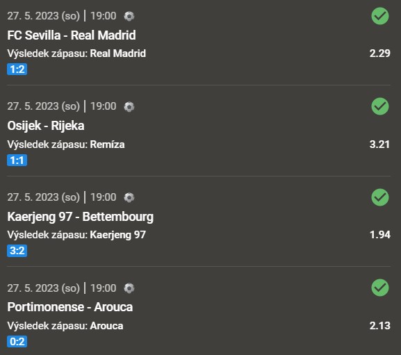 Vrátíme se k tiketu, který byl sestaven před měsícem se zápasy, které se hrály 27. května. Tento tiket sestavil neznámý sázející. Všechny sázky byly zaměřené na fotbalové utkání.