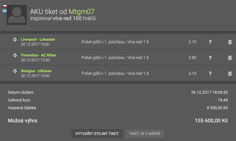 Podaří se tipaři s nickem MTGM07 trefit tiket s celkovým kurzem 19.45 na který vsadil rovných 8.000 Kč? Více jak 100 sázejících se inspirovalo jeho tiketem. Přidáte se také, nebo vsazené peníze poputují sázkovce?