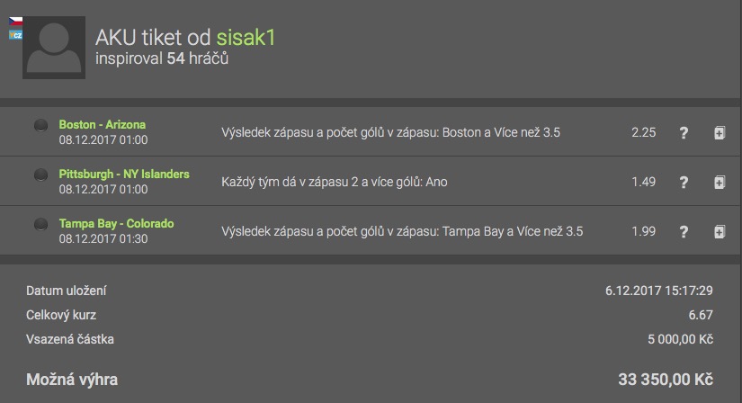 Podaří se tipaři s nickem SISKA1 trefit tiket s celkovým kurzem 6.67 na který vsadil rovných 5.000 Kč? Více jak 100 sázejících se inspirovalo jeho tiketem. Přidáte se také, nebo vsazené peníze poputují sázkovce?