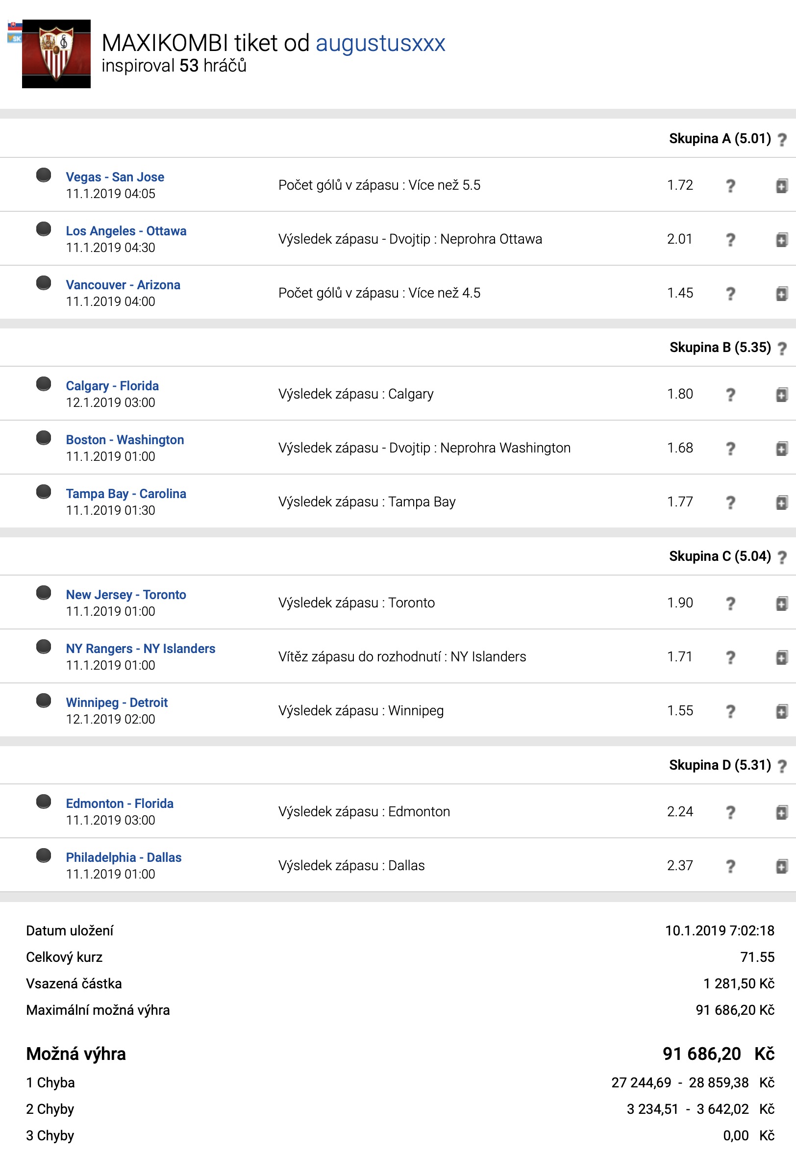 Tipař s nickem augustusxxx vsadil 1281,50 Kč na kombi tiket s kurzem 71.55. Více jak 50 sázejících se inspirovalo jeho tiketem. Přidáte se také, nebo vsazené peníze poputují sázkovce?