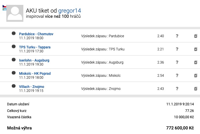 Tipař s nickem gregor14  vsadil 10.000 Kč na tiket s kurzem 77.26. Více jak 100 sázejících se inspirovalo jeho tiketem. Přidáte se také, nebo vsazené peníze poputují sázkovce?